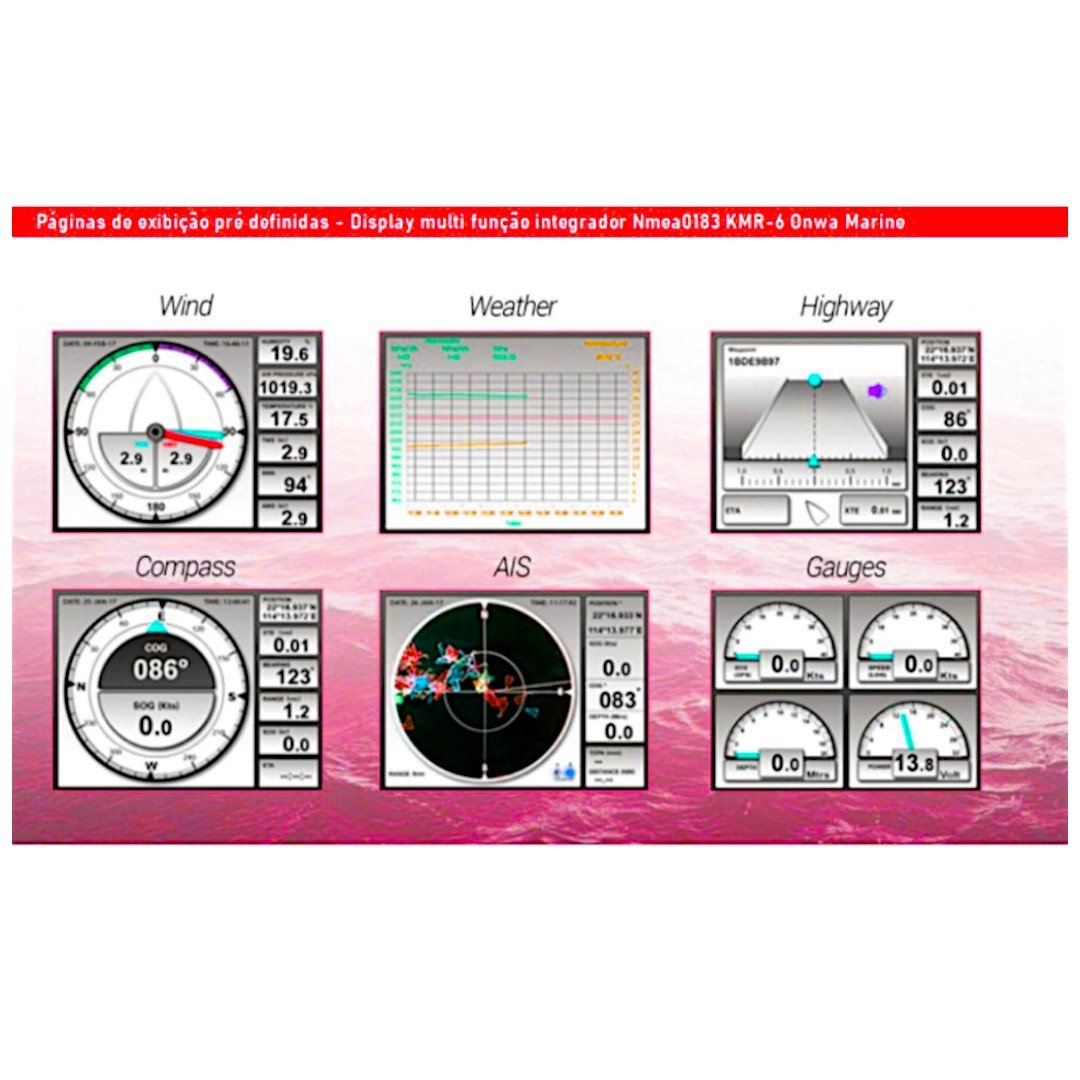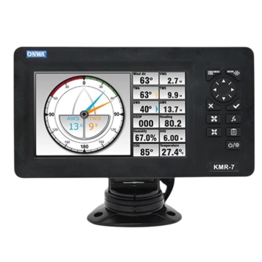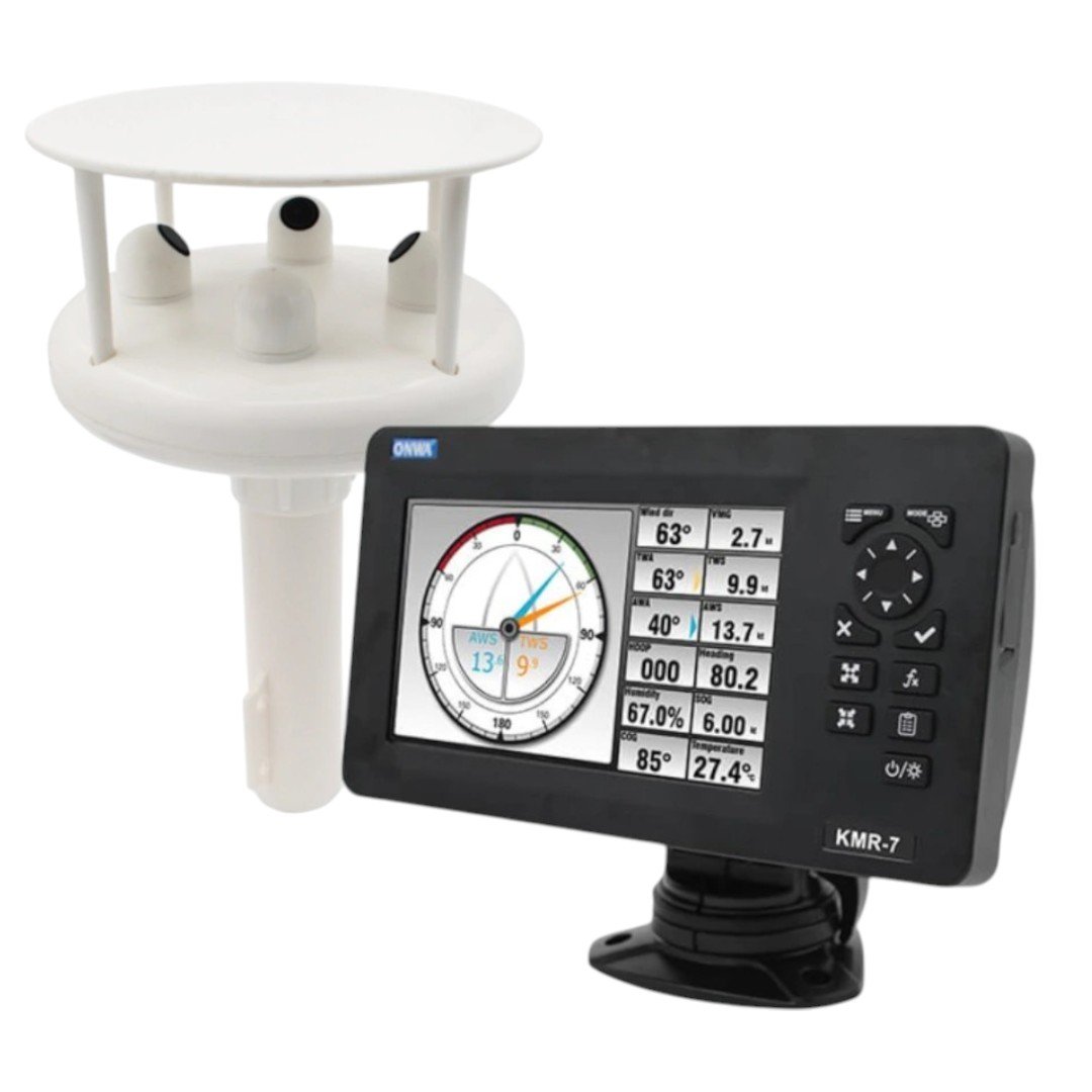 Estação meteorológica completa ONWA Marine, composta pelo display multifuncional KMR-7 e sensor ultrassônico KW-360, ideal para aplicações náuticas, profissionais e ambientes exigentes.