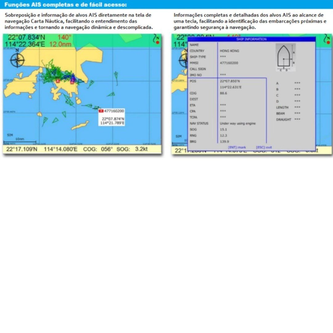 Além da função radar AIS que mostra todas embarcações com AIS e balizamento AIS próximo, ainda é possível plotar todas essas informações na carta náutica.