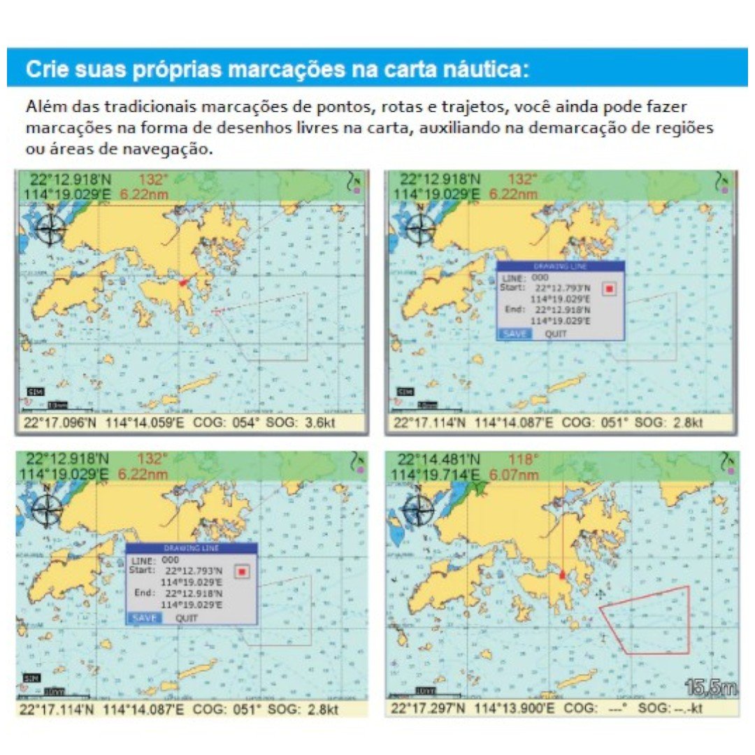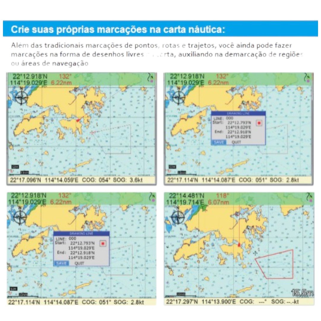 Permite criar marcações personalizadas diretamente na carta, além de possuir diversos alarmes de navegação e monitoramento para maior segurança durante a navegação.