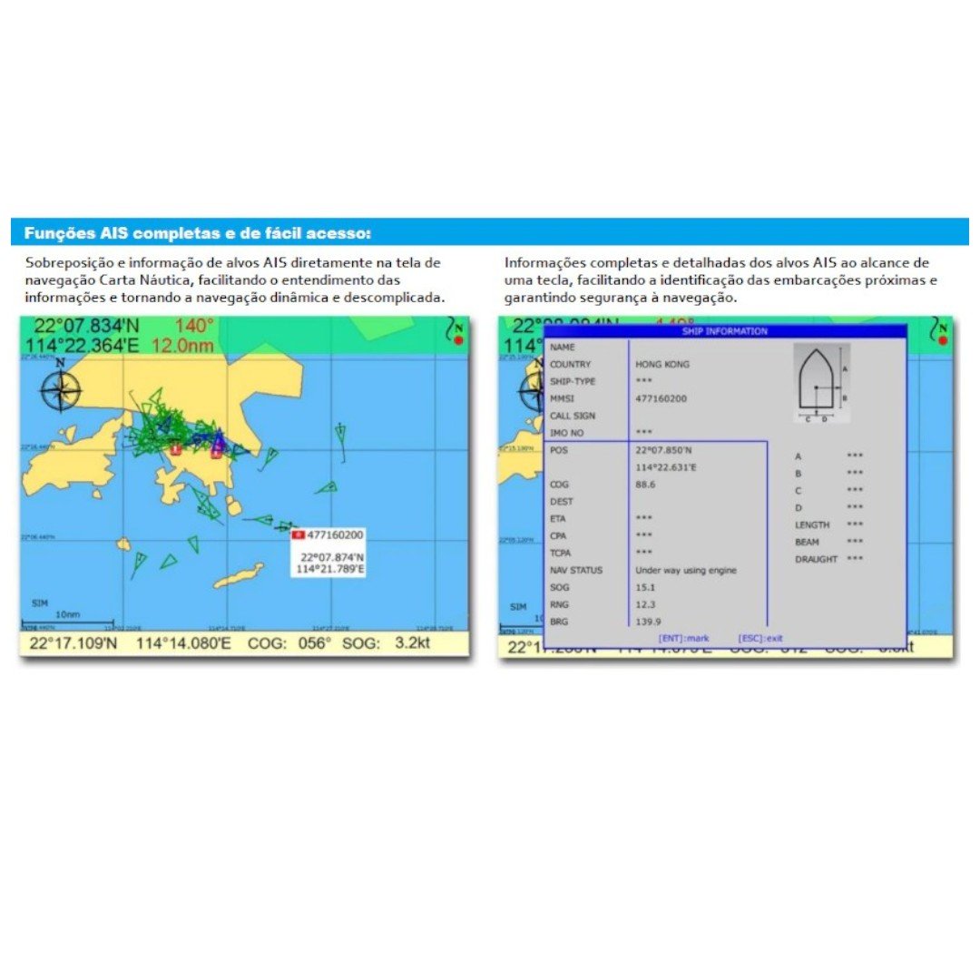 Conta com carta náutica Kchart Onwa Marine com cobertura da América do Sul pré-instalada, além de módulo transceptor AIS B+ interno, permitindo transmissão e recepção de informações de embarcações próximas.