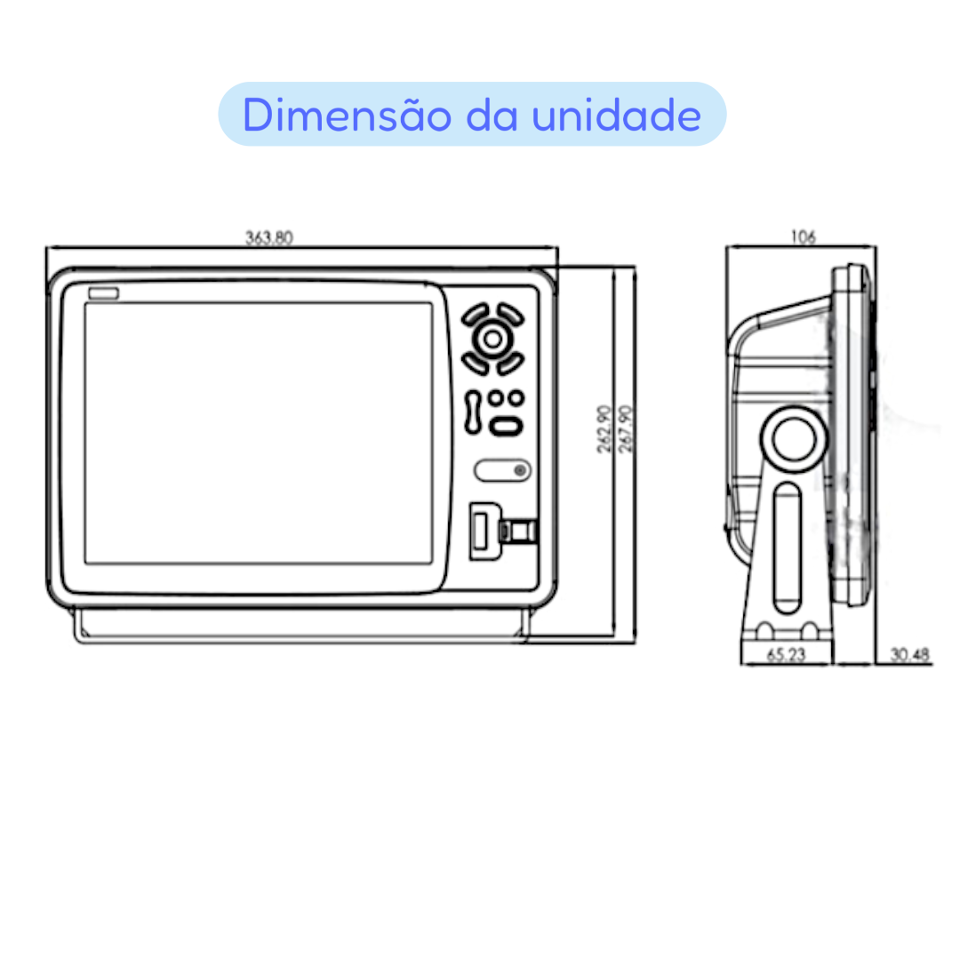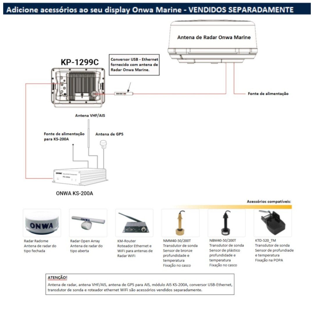 Aceita transdutor de sonda Onwa Marine de até 1kW (1.000 watts de potência). Consulte modelos de transdutores disponíveis.